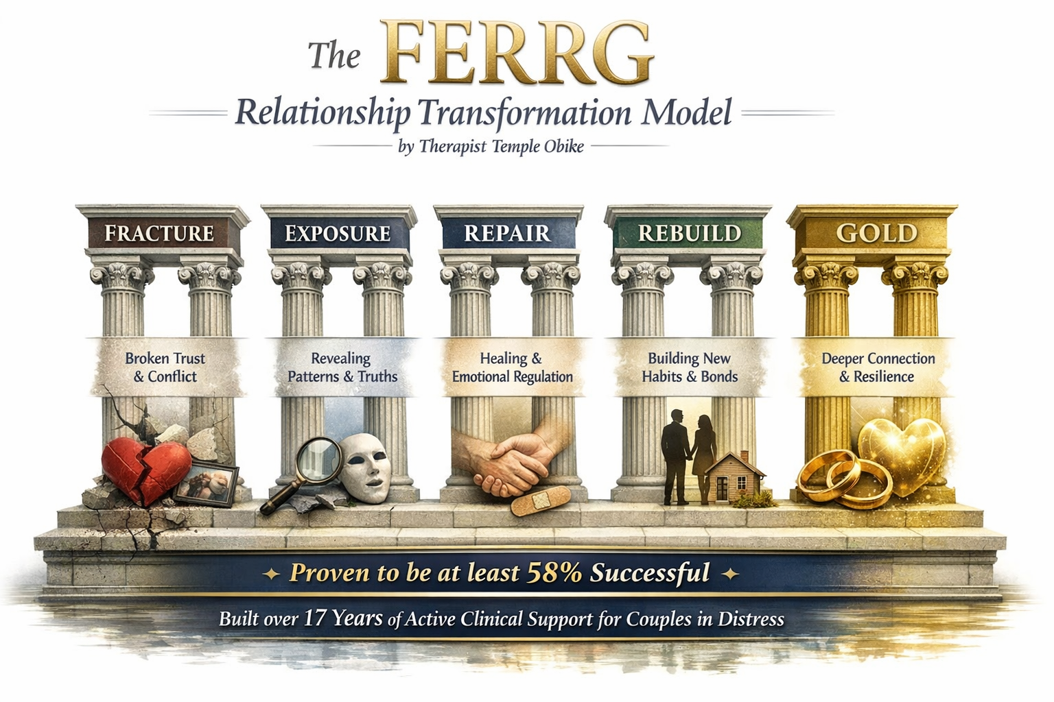 The FERRG Relationship Transformation Model created by Therapist Temple Obike is a 5-phase therapeutic frameworkdesigned to move relationships from total breakdown to transformation in 4 weeks. It focuses not just on resolving conflict, but on rewiring relational patterns at their core.